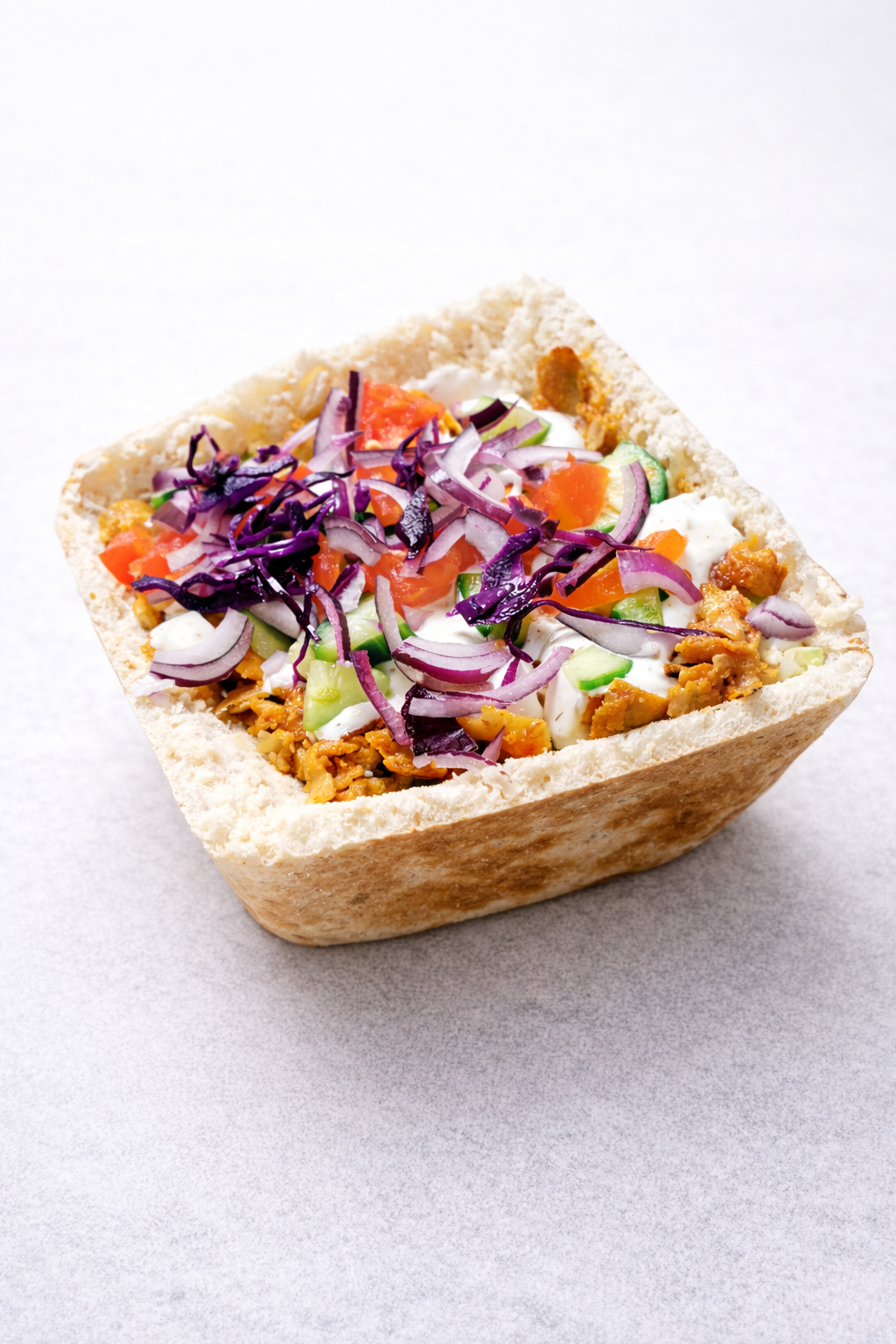 Delikatnie chrupiąca bułka z mięsem do wyboru: kurczak, wołowo-baranie lub mix. W środku świeże warzywa – kapusta biała, pekińska i czerwona, pomidor, ogórek, czerwona cebula oraz sosy.